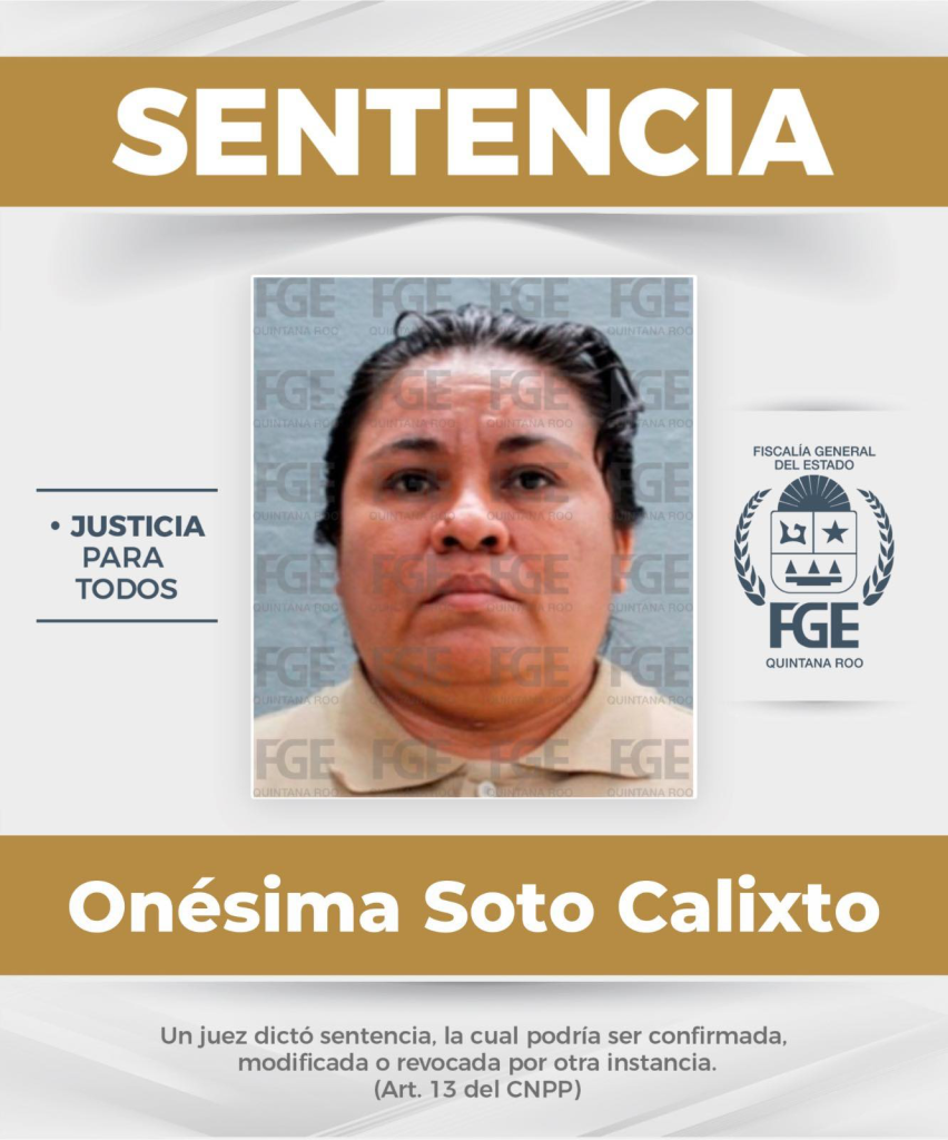 Luego de examinar las pruebas aportadas, las mismas que acreditaron la plena responsabilidad penal de Onésima Soto Calixto en los hechos por los que fue imputada, el Juez le dictó la sentencia 16 años y ocho meses de prisión, además de que deberá pagar una multa por la cantidad de 89 mil 690 pesos.